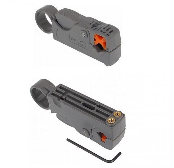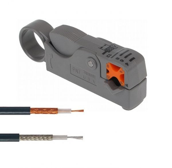 Qualsiasi installatore sa quanto è fastidioso, senza un opportuno utensile, spelare la guaina dei cavi schermati coassiali RG58 e RG59 ed RG6. Con questo piccolo utensile tascabile, l’operazione avverrà in un attimo. Questo spela fili è stato progettato per rimuovere contemporaneamente l`isolante esterno ed interno di cavi coassiali. Può essere tarato per diversi diametri di cavo. E`inclusa una chiave a brugola per la regolazione.