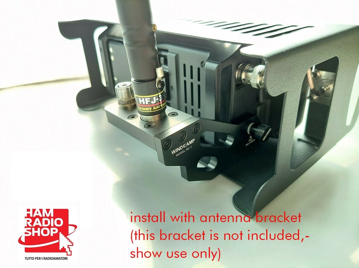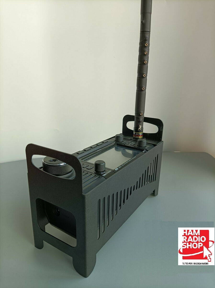 Custodia metallica protettiva per icom IC-705 con maniglie laterali e coperchio in plexiglass trasparente e connessione SO239 frontale.