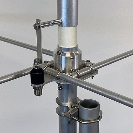 Il “Ground Plane” è composto da 4 robusti radiali della lunghezza di 2,7m, “Full-Quarter Wave” realizzati in due sezioni telescopiche con fissaggio a fascetta, di diametro e spessore rispettivamente 13×1.25mm e 10x1mm.