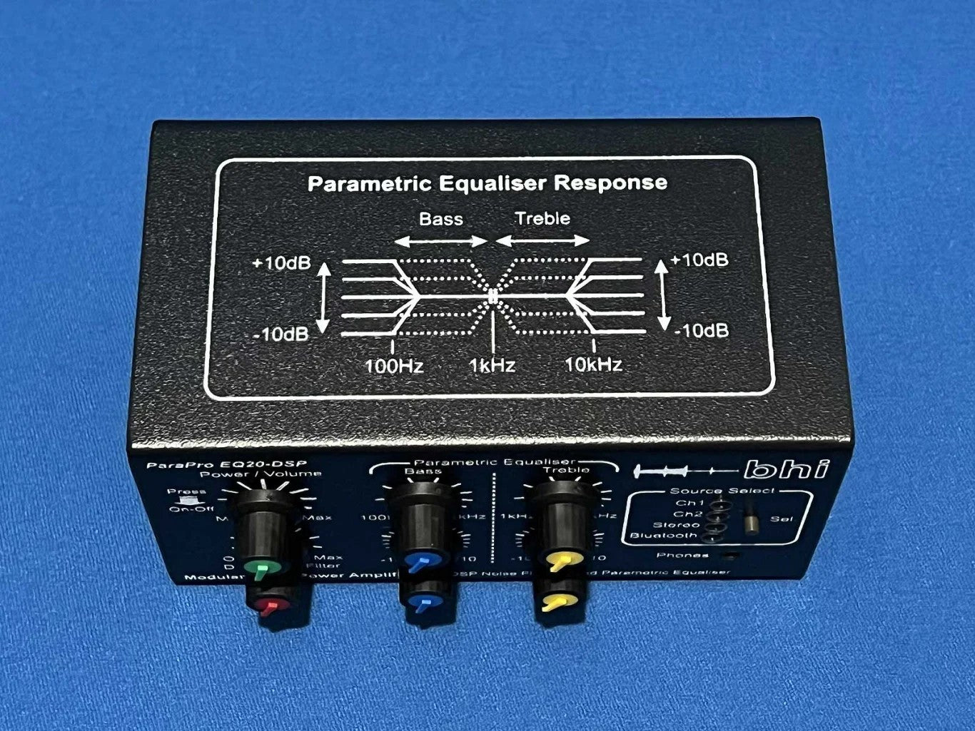 L' EQ20-DSP è alloggiato in un case ABS compatto di qualità. Ci sono controlli per Accensione/Volume insieme a due canali equalizzatore parametrico etichettati Bassi e Alti, con la frequenza centrale dei Bassi regolabile da 100 Hz a 1 kHz e gli Alti che coprono da 1 kHz a 10 kHz. Utilizzati insieme, questi controlli forniscono due bande di regolazione di ±10 dB da 100 Hz a 10 kHz. Cancellazione del rumore bhi DSP. Il controllo del filtro del rumore bhi consente di regolare il livello del filtro da spento (DSP bypassato) a 40 dB di cancellazione del rumore.