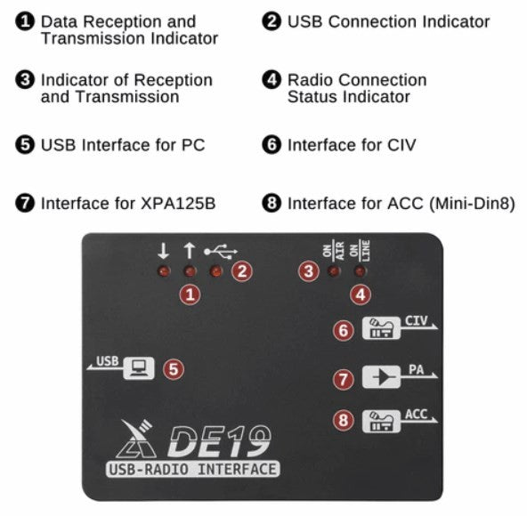 Xiegu DE-19 è un adattatore di espansione esterno. Integra un'unità di interfaccia USB, isolamento, unità di amplificazione e unità di interfaccia che funzionano con Xiegu G90, Xiegu G106 e Xiegu XPA125B. Può fungere da adattatore esterno per i modelli precedenti ed è facile da collegare a un PC per il controllo o la comunicazione dei dati.