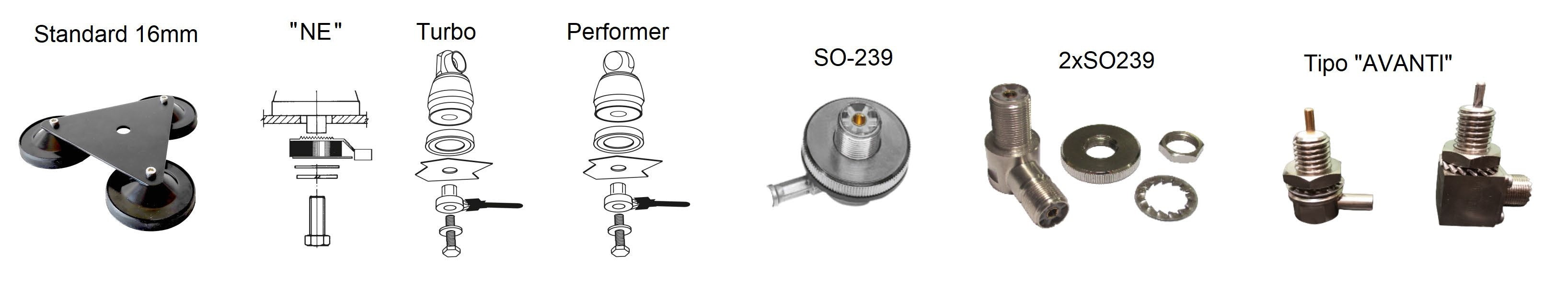 Il foro standard da 16mm consente il montaggio di tutti i connettori tipo SO239, “Avanti”, “NE”, “Turbo” e “Performer” senza dover apportare alcuna modifica. Allargando il foro a 19mm, possono essere installate basi professionali tipo “S” ed “SL”.