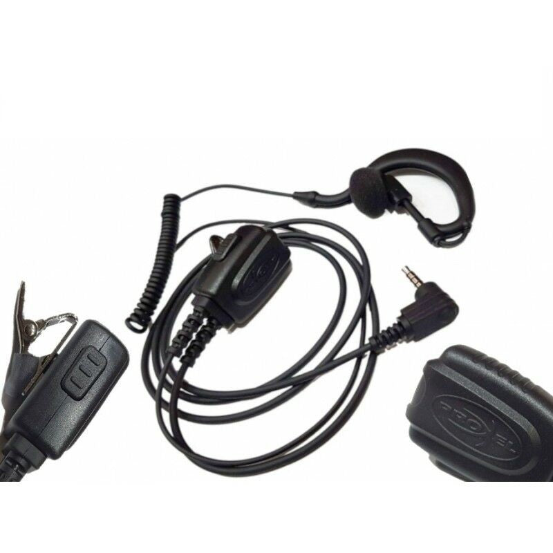 Micro-Auricolare professionale Proxel con supporto G shape in gomma lattice, PTT e cavo schermato spiralato nero. Ideale per usi generici, tempo libero, Hotel, ristoranti, servizi di noleggio, spettacolo, etc.. Connettore mono jack a 90 ° Yaesu/Vertex 3,5 mm 4 poli. Vedi compatibilità