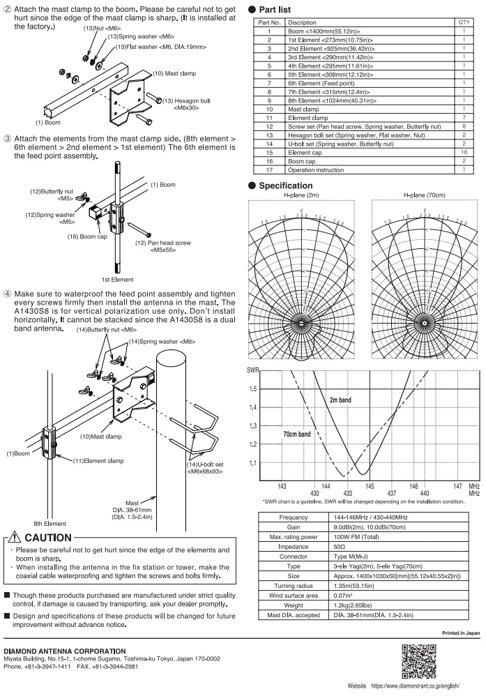 Diamond promuove l'A1430S8 introducendo un'antenna yagi dual-band che può essere utilizzata in modo compatto sia per uso mobile che fisso'' perché è piccola, leggera (1,2 kg) e compatta (dimensioni esterne massime 1400 x 1030 x 50 mm) . Di seguito sono riportati alcuni estratti dei materiali dei nuovi prodotti dell'azienda.