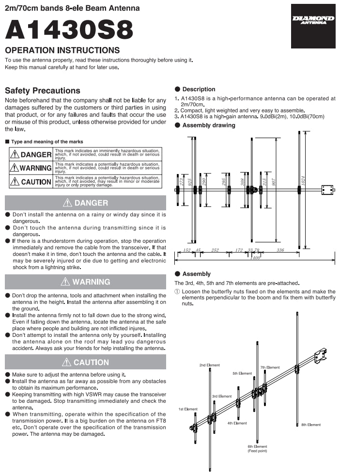 L'A1430S8 è un'antenna yagi che supporta due bande di 144/430 MHz con una sezione di alimentazione. Ci sono otto elementi lunghi e corti, ma l'elemento più lungo funziona come uno Yagi a 3 elementi nella banda dei 144 MHz e l'elemento più corto funziona come uno Yagi a 5 elementi nella banda dei 430 MHz.