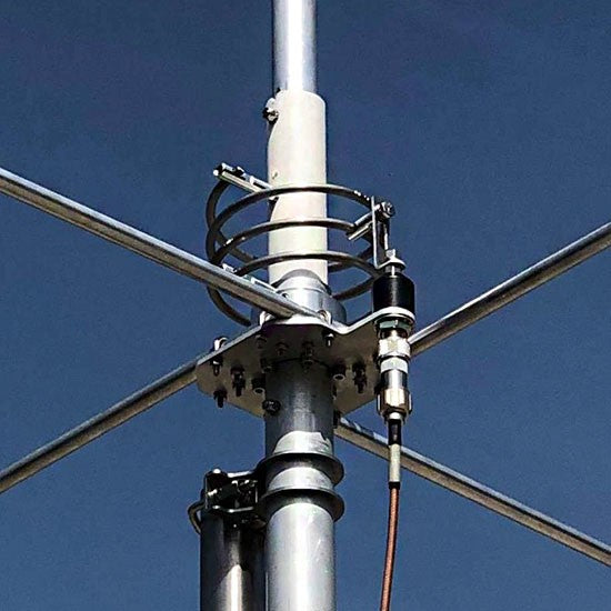 Il “Ground Plane” è composto da 4 robusti radiali della lunghezza di 1.4m, “Full-Quarter Wave” realizzati in tubo a sezione unica di diametro e spessore rispettivamente 13×1.25mm che vengono fissati alla piastra di sostegno mediante due cavallotti (U-Bolt) e dadi autobloccanti. Nella zona di fissaggio sono forniti 4 rinforzi in fibra di vetro che irrobustiscono le giunzioni ed evitano lo schiacciamento dei tubi.