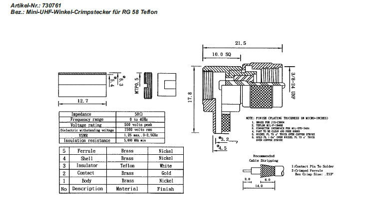 Il connettore a spina mini UHF possiede caratteristiche elettriche e meccaniche molto buone una struttura modificata e ridotta rispetto al connettore a spina UHF. Grazie alla dentatura della chiusura filettata è ideale per l'impiego mobile e previene tutti i tipi di distacco e torsione del connettore dovuti a vibrazioni.