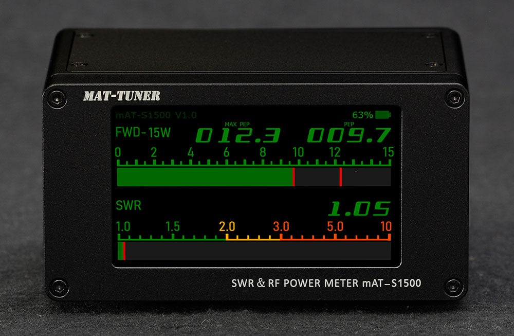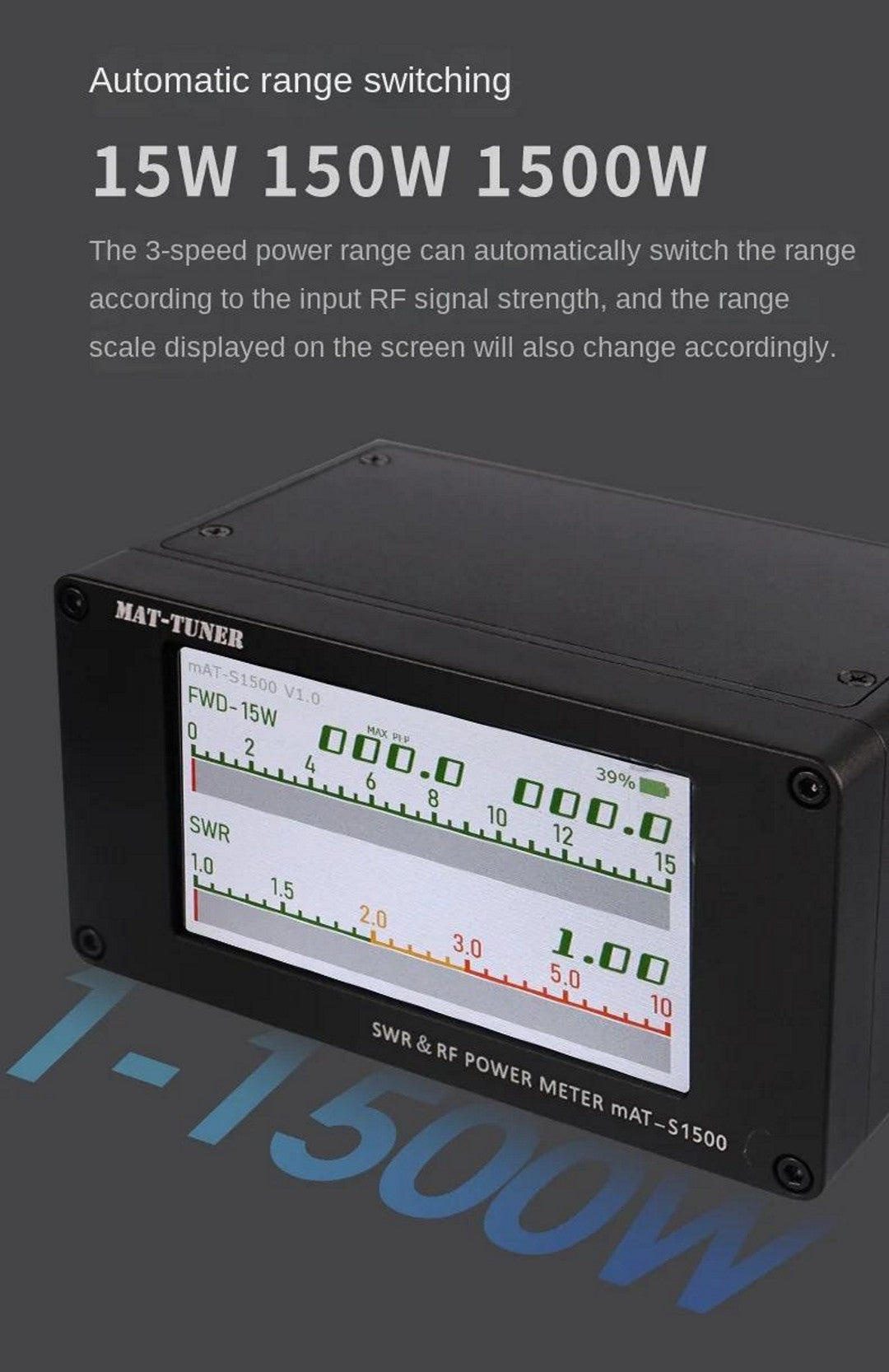 Il mAT-S1500 è progettato come uno strumento accurato per il monitoraggio delle prestazioni della stazione. Utilizza due chip di misurazione RF dedicati, che possono misurare con precisione la potenza e l'SWR del sistema RF, ma non possono visualizzare informazioni come spettro e impedenza. Il mAT-S1500 è dotato di uno schermo a colori TFT diagonale da 4,3" che visualizza la potenza RF corrente e l'SWR tramite barre e display digitali. Ha due metodi di alimentazione. Questo mAT-S1500 è dotato di due batterie al litio ad alta capacità 18650, che possono funzionare senza alimentazione aggiuntiva. Utilizzando la presa di ricarica TYPE-C, gli utenti possono facilmente utilizzare il caricabatterie del telefono per caricarlo. Il caricabatterie non è un accessorio di questo misuratore e l'utente deve prepararlo da solo. Ha anche una presa di alimentazione CC esterna. Puoi alimentarlo con un alimentatore esterno, la batteria interna non viene più utilizzata. Questa presa non può caricare la batteria integrata. Il mAT-S1500 è un misuratore automatico molto facile da usare. Ha un solo interruttore di alimentazione e può impostare automaticamente la portata in base al segnale RF in ingresso. Può anche impostare automaticamente il colore di sfondo dello schermo in base alla luminosità della luce ambientale, aiutando gli utenti a vedere meglio il display.