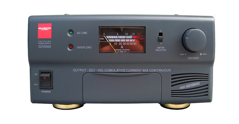 Gli alimentatori switching DIAMOND della serie GZV-  sono alimentatori switching di alta potenza (40A per il GZV-4000 e 60A per GZV-6000) ma di dimensioni e peso ridotti. Sono stati progettati e costruiti specificamente per l'alimentazione di apparati ricetrasmittenti fornendo una tensione variabile compresa tra 5 e 15 Vcc. Sono dotati di circuiti di protezione: in corrente, che interviene in caso di sovraccarichi oltre il valore limite incluso il cortocircuito, in temperatura onde prevenire surriscaldamenti che potrebbero danneggiare l'alimentatore. Un indicatore, posto sul frontale dell'alimentatore, segnala quando i circuiti di protezione si sono attivati. Inoltre dispone, visto l'uso a cui è dedicato, di un particolare circuito di protezione alle interferenze di radio frequenza (RFI). Lo strumento analogico visualizza la tensione o la corrente erogate, selezionabili dal selettore posto sul frontale. Dispongono di tre uscite di alimentazione in cc: una posteriore a boccole di elevata potenza (40A o 60A secondo il modello), mentre due uscite - una con terminali SNAP-ON da 6A e una con presa per accendisigari - sono celate frontalmente sotto un pannellino amovibile. E' altresi presente un altoparlante frontale da 8W e 8hm di impedenza collegabile al ricetrasmettitore mediante una presa jack da 3,5mm.