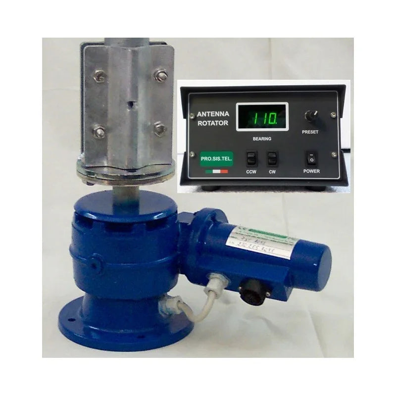Rotore d'antenna adatto per carichi medio-grandi con una capacità massima di 2.5 m2. Tecnologia a vite senza fine con prestadio a riduttore planetario e motore in corrente continua.