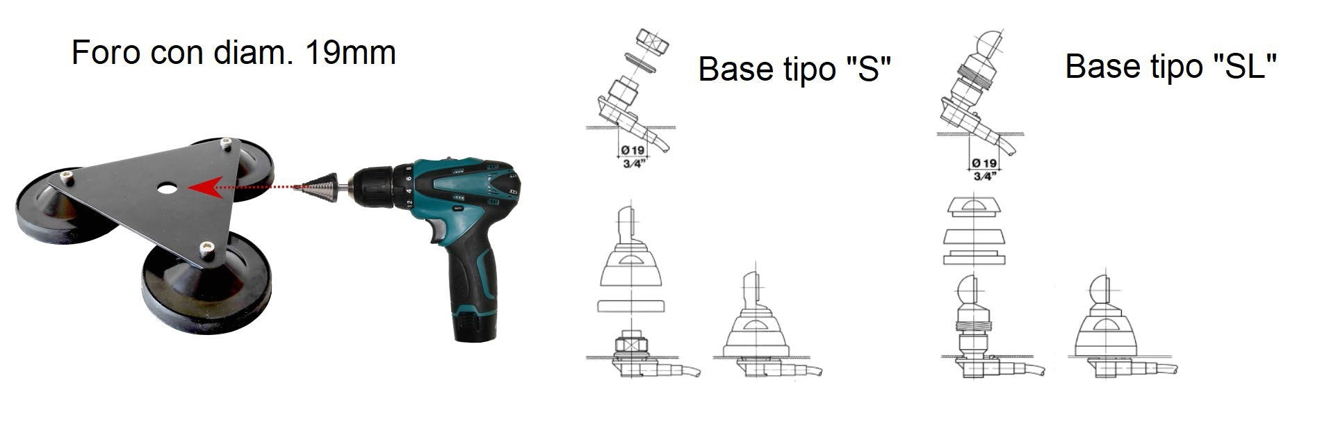 Il foro standard da 16mm consente il montaggio di tutti i connettori tipo SO239, “Avanti”, “NE”, “Turbo” e “Performer” senza dover apportare alcuna modifica. Allargando il foro a 19mm, possono essere installate basi professionali tipo “S” ed “SL”.