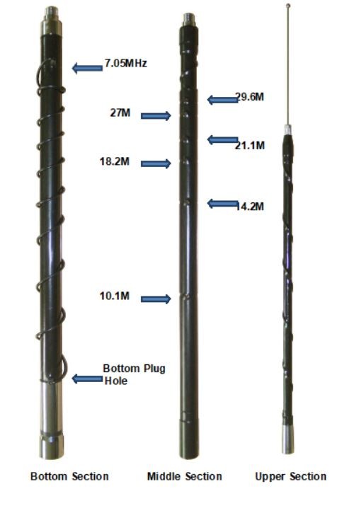 2) 7,05 M, 10,1 M, 14,2 M, 18,2 M, 21,1 M, 27 M, 29,6 M. mettere un'estremità del cavo di connessione nel foro inferiore e l'altra estremità dal basso ai fori superiori, come mostrato nel disegno (il cavo di collegamento deve avvolgere l'antenna a spirale).