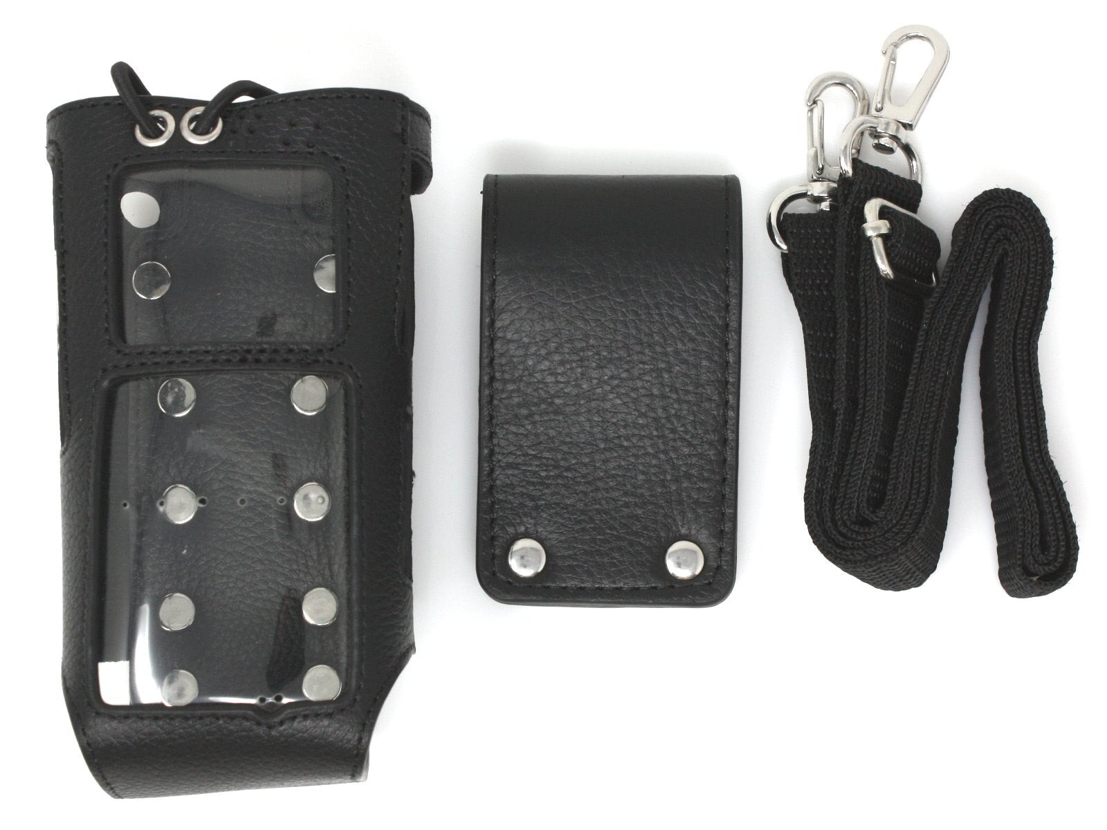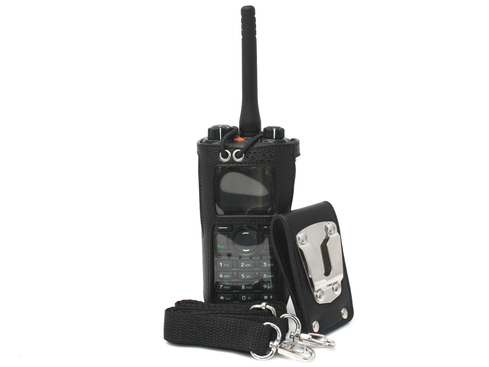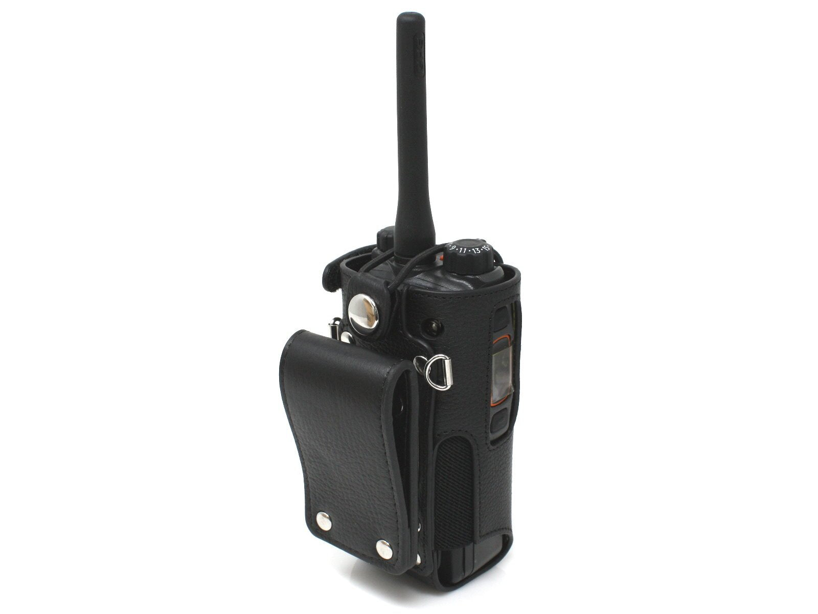 La custodia in pelle con connettore girevole per una batteria da 2000 mAh per radio DMR Hytera si aggancia al passante per cintura tramite un meccanismo a sgancio rapido.