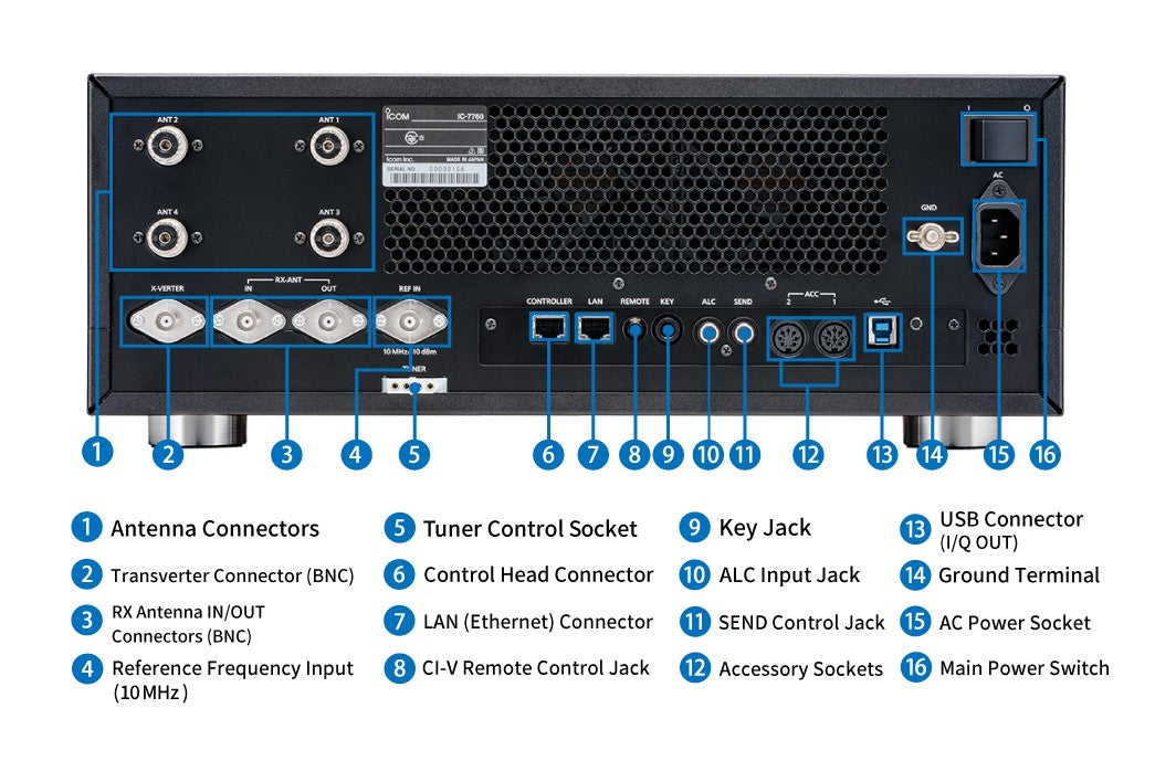 L’IC-7760 utilizza un LDMOS-FET da 450 W e 65 V nella sezione PA, combinato con un grande dissipatore di calore e un efficace sistema di raffreddamento per ottenere un ottimo funzionamento a piena potenza 200 W (200 W e 1 ora di trasmissione continua con ingresso 100 V CA a temperatura ambiente 25 ?).
