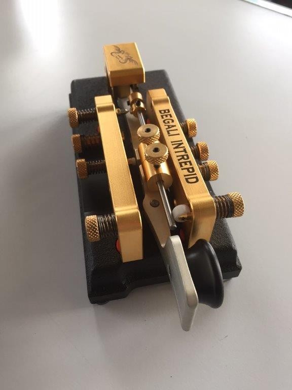 Il pendolo orizzontale, che produce i dits di un carattere Morse, è azionato da un ingegnoso meccanismo a leva, ed è rivolto verso l'operatore. I pesi scorrevoli consentono di regolare la velocità da circa 18wpm a oltre 40wpm.La base di questa chiave è realizzata mediante fusione e fusione di ferro fosfatato. Di conseguenza, non ci saranno due basi identiche, anche se la forma e le dimensioni complessive sono assicurate dallo stampo. Per questo processo è caratteristica una superficie ruvida e irregolare con motivi individuali.L'Intrepid, con la sua distinta base in ghisa, pesa circa 2750 grammi
