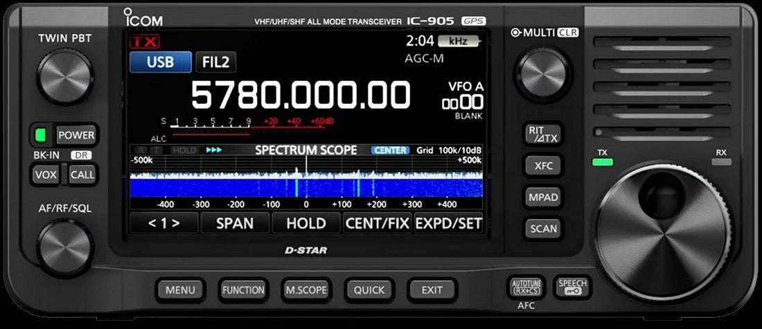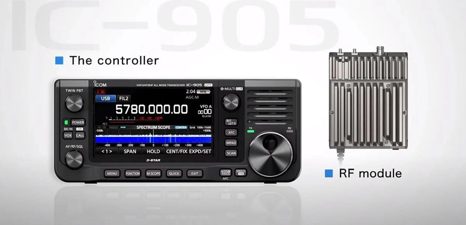 IC-905 è il primo ricetrasmettitore multibanda VHF/UHF/SHF con copertura 144/430/1200/2400/5600 MHz e 10 GHz (quest’ultima banda con transverter CX-10G opzionale) e multimodo SSB, CW, RTTY, AM, FM incluso ATV (Amateur TV) in modalità analogica FM e D-STAR “Digital Smart Technologies for Amateur Radio” (modi DV/DD). La modalità DD permette trasmissione dati fino alla velocità di 128 kbps, con possibilità di fungere anche da punto di accesso D-STAR e funzionare in modalità terminale.